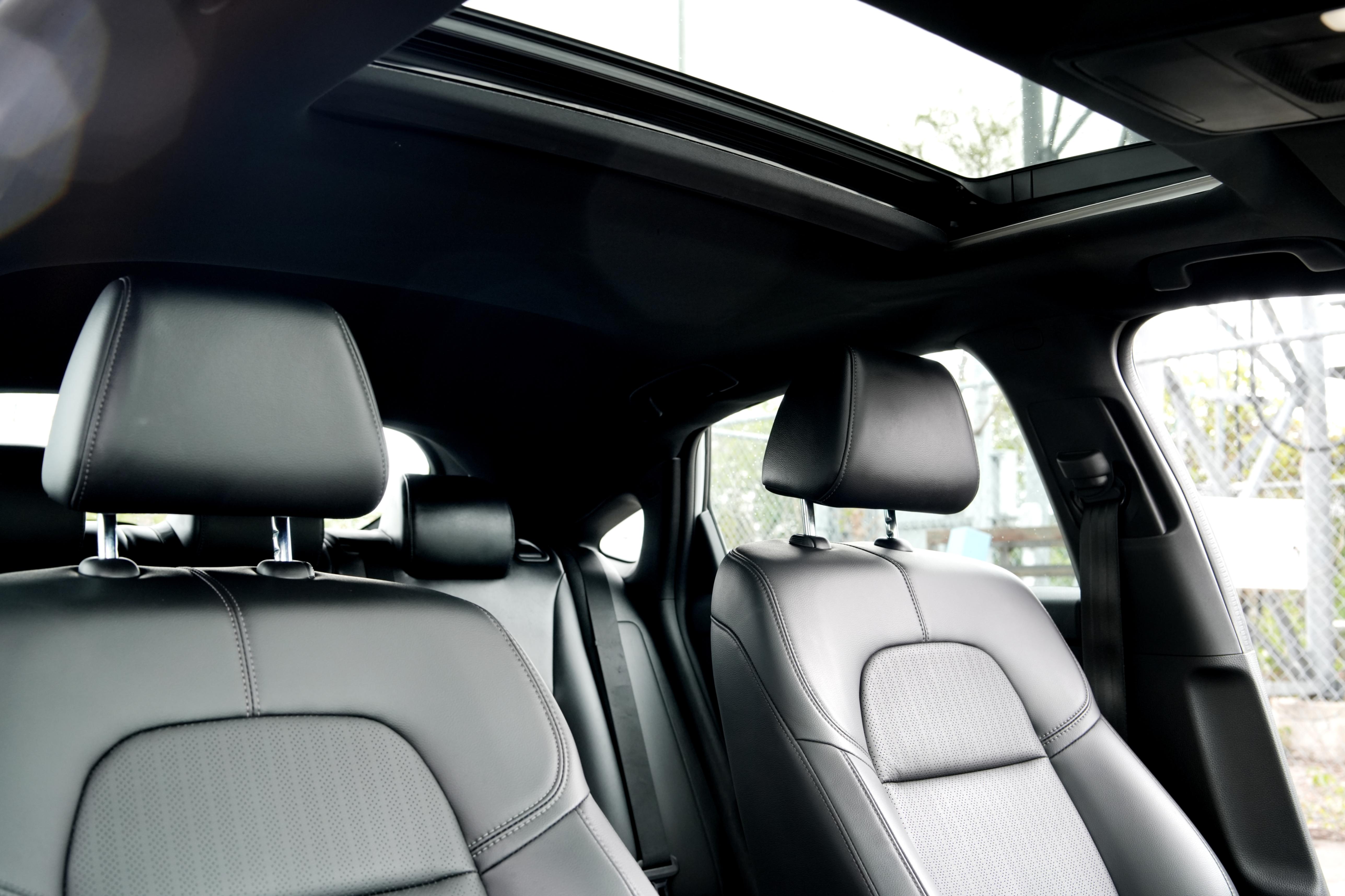 Plush interior trimmed in leather seating surfaces, heated front seats, one‑touch power moonroof.